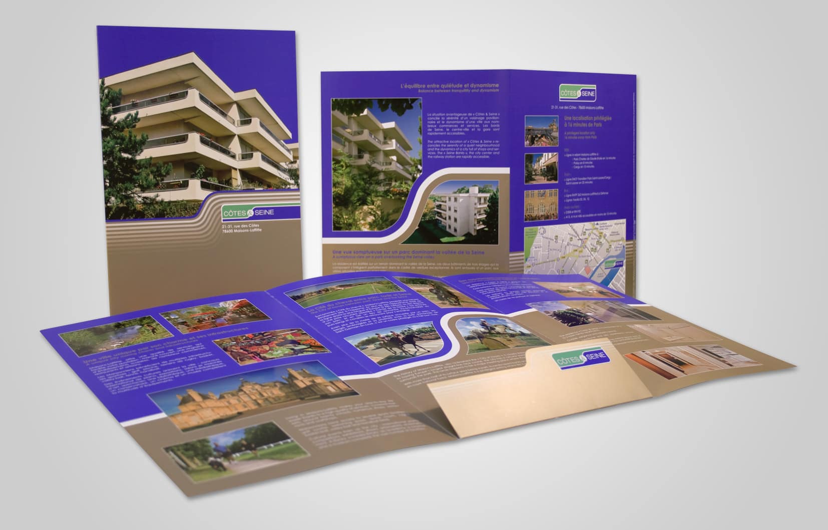 For the Côte & Seine real estate project at Maisons-Laffitte, the promotional document we presented is based on the original architectural structure designs combined with quality printing techniques by means of a customized cut-to-size, as well as metallic inks and in spot colours.